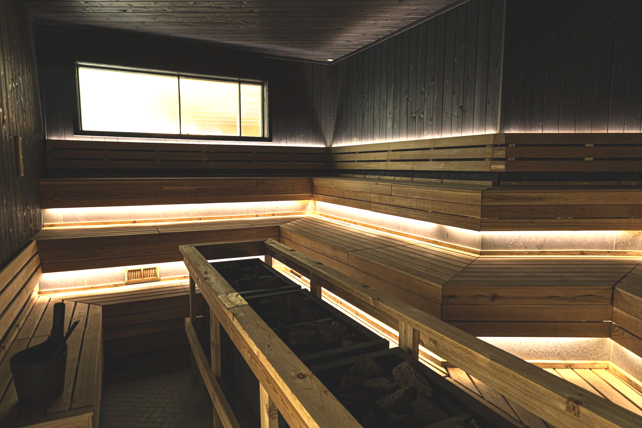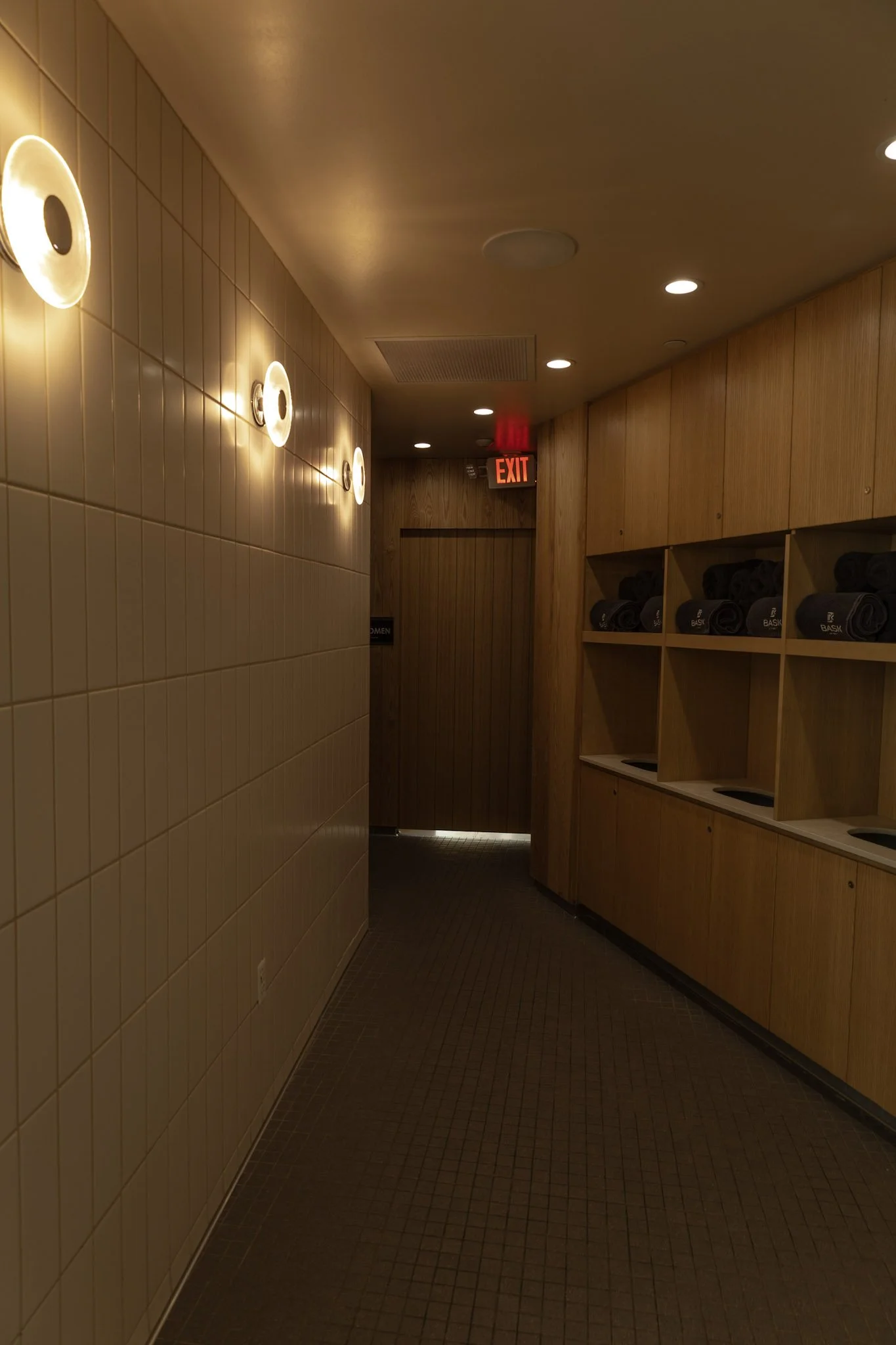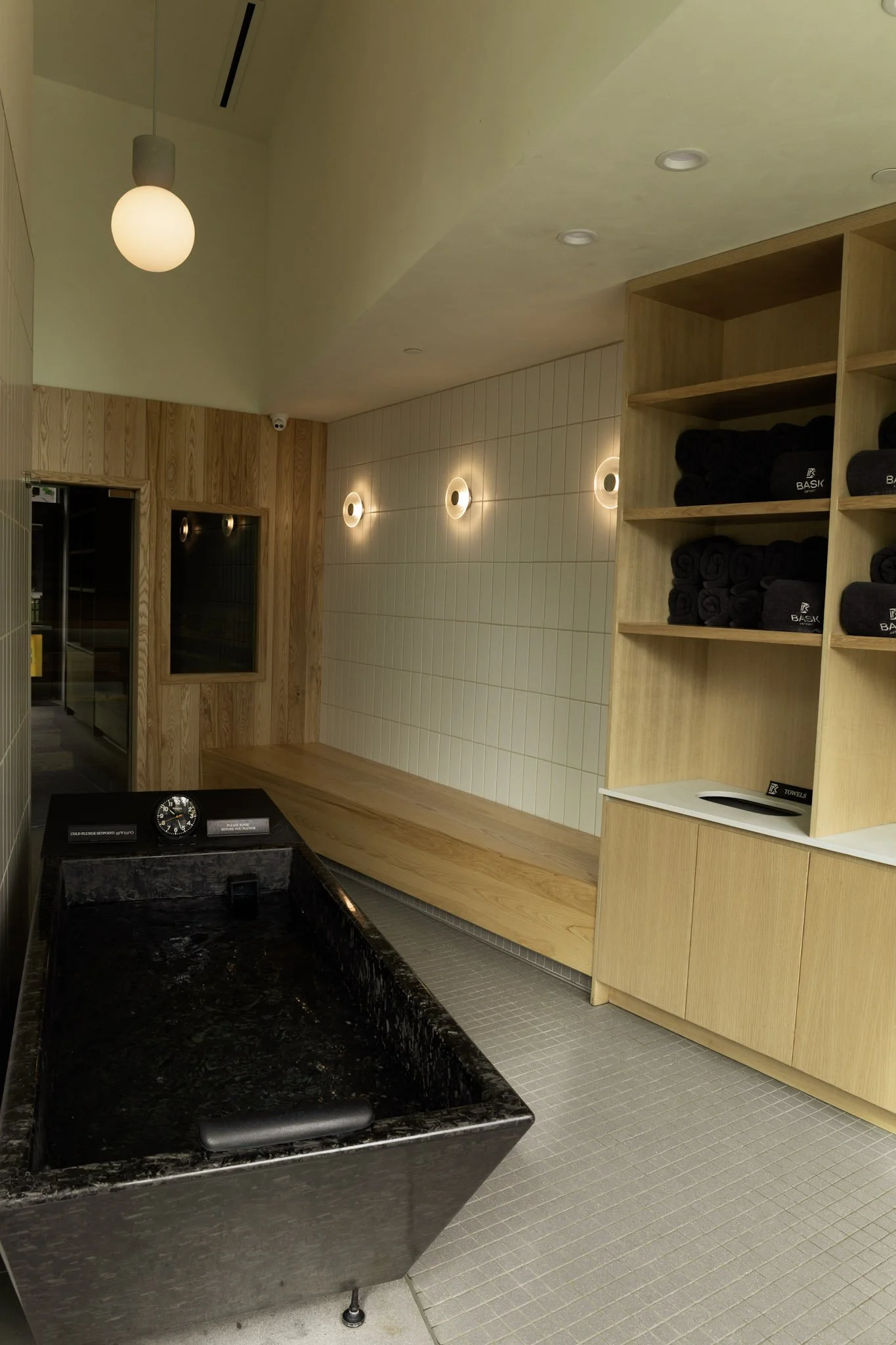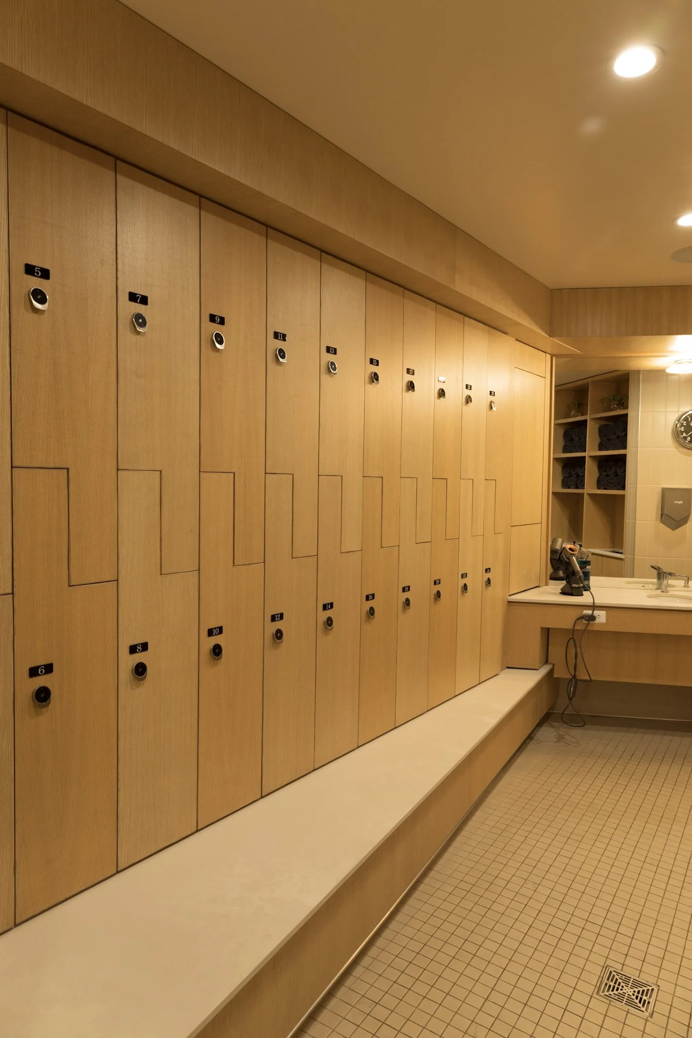 This high-end health spa features custom ash wood walls and ceilings, state-of-the-art sauna rooms, cold plunge installations, and sleek modern cabinetry. Every element was precisely crafted, including integrated benches, lighting, and built-in storage that bring function and beauty to the space.